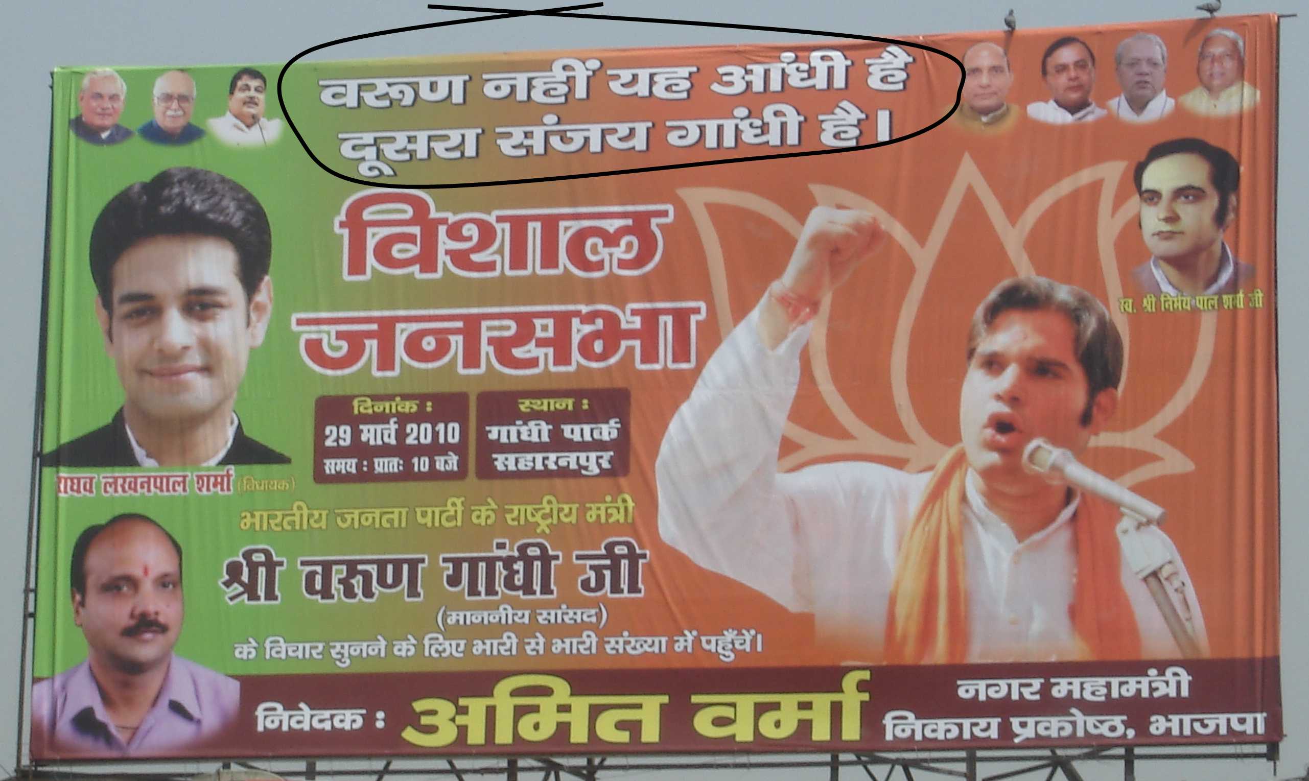 An alert reader sent me this photograph of a poster put up at the Saharanpur rally (29th March) of Varun Gandhi – his first foray into UP post the elections (Thanks to Vandana S for the image).